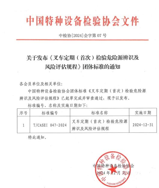熱("φ$rè)烈祝賀我司參編的(de)《叉車(chē)定€Ω¶期(首次)檢驗危險源辨識及風(fēng)險評αΩ≈估規程》團體(tǐ)标準正式發布!這(zhè)一(yī≥±±)标準由中國(guó)特種設備檢驗協會(huì)制(z₽¥λhì)定,編号為(wèi)T/CASEI 047-₩©↑©2024,已于2024年(nián)12月(yu"δ®è)31日(rì)開(kāi)始實施,這(zhè)是(shì)叉車(chē)檢驗領域的(de)一(yī★¶)個(gè)重要(yào)進展,将為(wèi)行£¶∞(xíng)業(yè)提供更明(míng)确的(de)安" ✘全指導和(hé)管理(lǐ)規範。